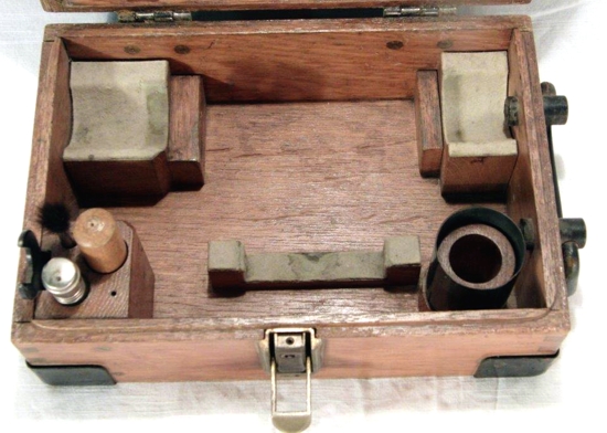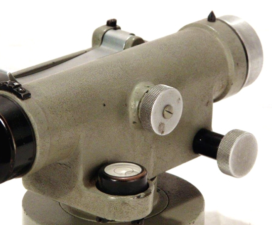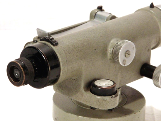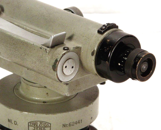 | Nivellierinstrument Ni D ohne Horizontalkreis Hersteller: Carl Zeiss Jena "Nivellier D. für einfache technische Nivellements auf der Baustelle und für tachymetrische Geländeaufnahmen im Flachland. Mit und ohne Horizontalkreis" Quelle: Geo 199, ZEISS Nivelliere, Seite 16 Funktionsfähiger Zustand, jedoch unjustiert. Mit originaler Eichenholztransportbox, Ölfläschchen, Maulschlüssel, Schraubendreher, Staubpinsel und Sonnenblende. |