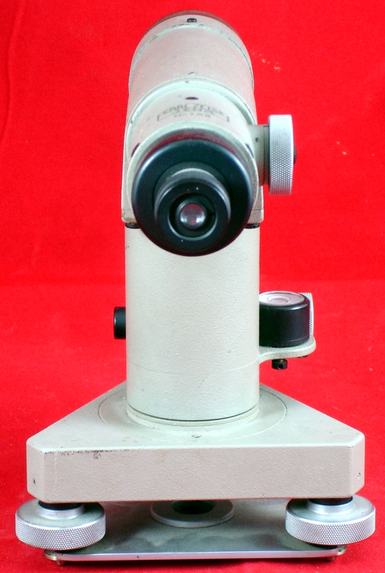 "Verwendungszweck Quelle: Druckschrift Fe 178/III, ZEISS Flucht-Fernrohr, ca. von 1939 Die Bauteile, aus denen dieses Fluchtfernrohr gefertigt worden ist, stammen offensichtlich aus der Nivellierreihe B. Bis auf die seitlich angeordnete Röhrenlibelle und die Feinkippschraube ähnelt das Flucht-Fernrohr fast komplett dem Ni B ohne Teilkreis. Ohne die Hilfe durch das ZEISS-Archiv in Jena hätte ich nicht herausgefunden, um was für ein Instrument es sich hier handelt. Danke an dieser Stelle an Herrn Dr. Wimmer! Funktionsfähiger Zustand. Ohne Transportbox und Zubehör. |