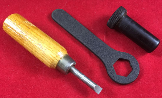 ![]() Das Zubehör: Schraubendreher, Maulschlüssel für das Stativ und das Ölfläschchen |