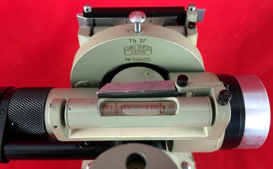 ![]() Am Vertikalkreis die Modellbezeichnung Th. IV, darunter der Hersteller Carl Zeiss Jena, darunter die Herstellungsnummer 54629 und vorn die Nivellierlibelle. |