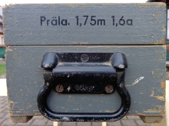 Invarlattenpaar 1,75 m - Nr. 58115 + 58773 Typ: mit 2 gegeneinander versetzten Teilungen "Um den bei Holzlatten möglichen unregelmäßigen Längenänderungen zu entgehen, werden bei Feinnivellements besondere Latten, Invarbandlatten, verwendet. Sie bestehen aus einem starren, im allgemeinen etwa 3 m langen Kasten aus Holz oder Leichtmetall, in den ein etwa 25 mm breites Invarband eingespannt ist. Während sich 3 m lange Holzlatten bei einer Temperaturänderung von 10 grd um 0,12 bis 0,24 mm in der Länge ändern können, ändert sich ein gleichlanges Invarband im Höchstfalle nur um 0,04 mm. Das Lattenmeter einer Invarbandlatte ist innerhalb eines großen Temperaturbereichs praktisch unveränderlich. Außerdem ändern hölzerne Latten infolge einwirkender Feuchtigkeit ihre Länge bis um mehrere Zehntelmillimeter auf 1 m, Invarbandlatten hingegen werden nicht beeinflusst. ... Das Invarband der Latten (Nivellierlatten mit Strichteilungen auf Invarband) ist mit versetzt angeordneten Teilungen (I und II) versehen, von denen jeder zehnte Teilstrich durch einen Strich am Ziffernfuß und jeder fünfte Teilstrich zwischen zwei Zehnerstrichen durch eine Kreismarke auf dem Kasten hervorgehoben ist. ... Die zulässige Abweichung für ein beliebiges Meter beträgt +/- 0,03 mm. Auf dem Kasten befinden sich zu beiden Seiten des Invarbandes schwarze arabische Ziffern auf weißem Grund, die für die Teilung I mit 00 und für die Teilung II mit 61 beginnen." Quelle: Fritz Deumlich, Manfried Seyfert, Instrumentenkunde der Vermessungstechnik, 3. Auflage, 1964, Seite 308 und 309 Auf Grund der obigen Beschreibung handelt es sich bei dem hier vorgestellten Lattenpaar offensichtlich um eine solche Variante, allerdings in einer Länge von 1,75 m. Beide Latten befinden sich in einem guten, gebrauchsfähigen Zustand. Als Zubehör sind die Fußplatten vorhanden. Die Transportkiste ist in einem guten, stabilen Zustand.Auf Grund der Seriennummern sowie des Herstellungsschildes einmal in deutscher und französischer Sprache handelt es sich um Latten aus unterschiedlicher Herstellercharge. |